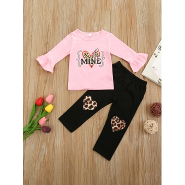 Lovely Casual O Neck Flared Letter Leopard Print Pink Girl Two Piece Pants Set