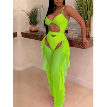 Lovely Trendy Hollow-out Mesh Flounce Design Green One-piece Swimsuit