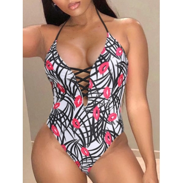 Lovely Sweet Lip Print Bandage Hollow-out Design Rose Red One-piece Swimsuit