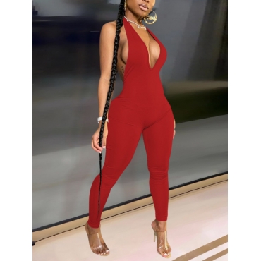 Lovely Sexy Deep V Neck Backless Red One-piece Jumpsuit
