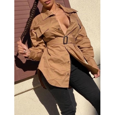 Lovely Stylish Pocket Design Metal Ring Decoration Asymmetrical Khaki Blouse