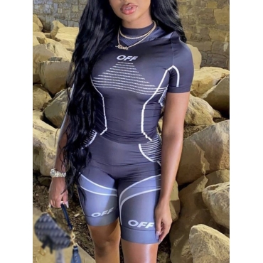 Lovely Sportswear Gradient Letter Print Striped Grey Two Piece Shorts Set