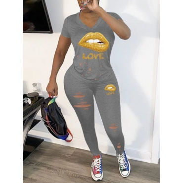 Lovely Casual V Neck Lip Print Grey Two Piece Pants Set