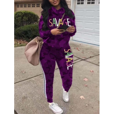 Lovely Sportswear Letter Print Striped Purple Two Piece Pants Set