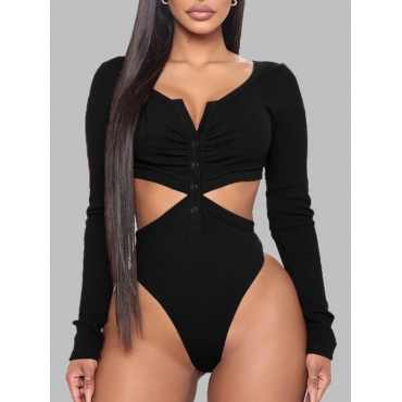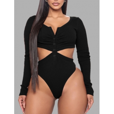 Lovely Sexy Button Design Hollow-out Black Bodysuit