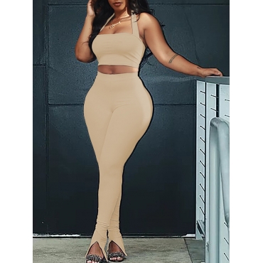 Lovely Sexy Off The Shoulder High-waisted Front Slit Khaki Two Piece Pants Set