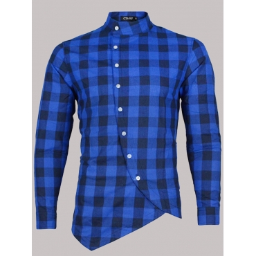 Lovely Stylish Plaid Print Asymmetrical Royalblue Men Shirt