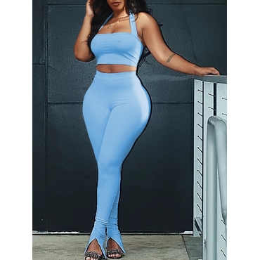 Lovely Sexy Off The Shoulder High-waisted Front Slit Blue Two Piece Pants Set