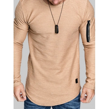 Lovely Trendy O Neck Zipper Pocket Asymmetrical Khaki Men T-shirt