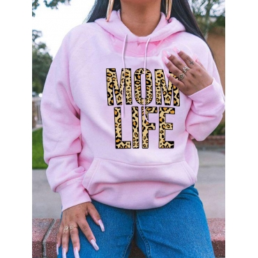 Lovely Street Hooded Collar Leopard Letter Print Pink Hoodie
