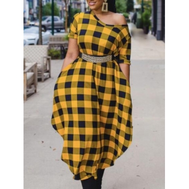 Lovely Casual Plaid Print Asymmetrical Yellow Mid Calf Dress(Without Belt)