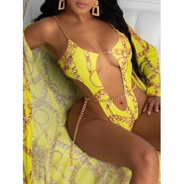 Lovely Sexy Floral Print Chain Strap Hollow-out Yellow One-piece Swimsuit(Without Veil)