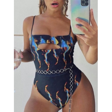 Lovely Chic Fire Print Hollow-out Black One-piece Swimsuit(Without Waist Chain)