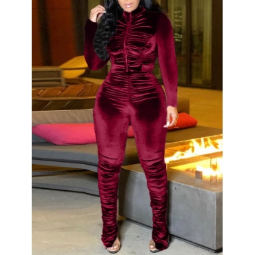 Lovely Casual Turtleneck Fold Zipper Design Wine Red Two Piece Pants Set