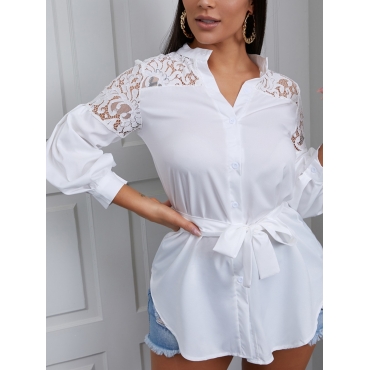 Lovely Formal Lace-up Mesh Patchwork Asymmetrical White Blouse