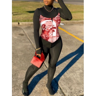 Lovely Street Turtleneck Print Patchwork Black One-piece Jumpsuit