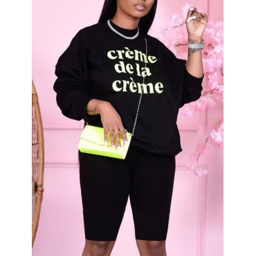Lovely Casual O Neck Letter Print Black Two Piece Shorts Set