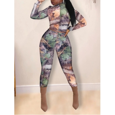 Lovely Chic Turtleneck Print Patchwork Grey Two Piece Pants Set(No-positioning Printing)