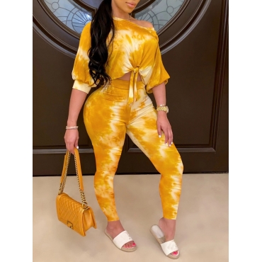 Lovely Casual One Shoulder Tie Dye Print Yellow Two Piece Pants Set