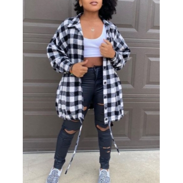 Lovely Casual Dropped Shoulder Sleeve Plaid Print Black Coat