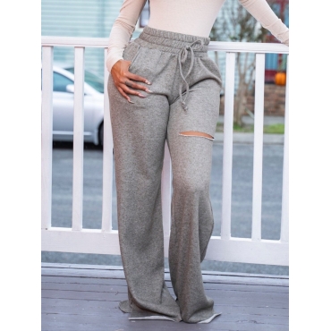 Lovely Casual Broken Holes Drawstring Design Floor Length Grey Pants