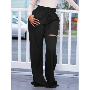 Lovely Casual Broken Holes Drawstring Design Floor Length Black Pants