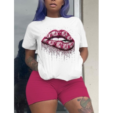 Lovely Casual O Neck Lip Print Red Two-piece Shorts Set