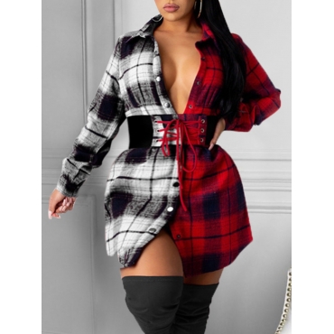 Lovely Stylish Turndown Collar Plaid Patchwork Bandage Design Red Plus Size Mini Dress