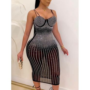 Lovely Sexy Sequined See-through Black Mid Calf Evening Dress