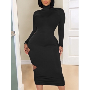 Lovely Sexy Turtleneck Hollow-out Black Mid Calf Dress