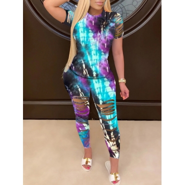Lovely Trendy O Neck Tie Dye Ripped Purple Two Piece Pants Set