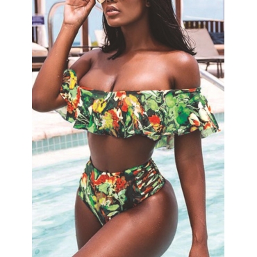 Lovely Sweet Floral Print Flap Over Green Tankini