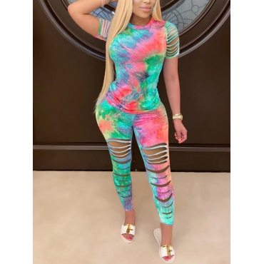 Lovely Trendy O Neck Tie Dye Ripped Green Two Piece Pants Set