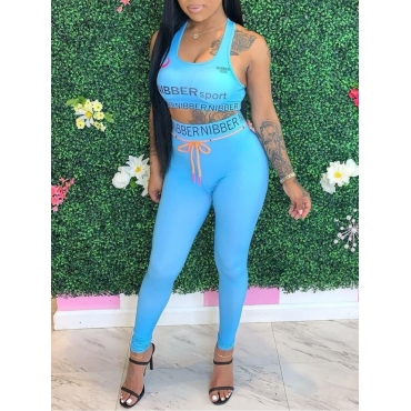Lovely Casual Tank Sleeveless Letter Print Drawstring Design Baby Blue Two Piece Pants Set