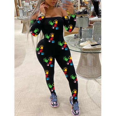 Lovely Sexy Off The Shoulder Palm Print Patchwork Black One-piece Jumpsuit