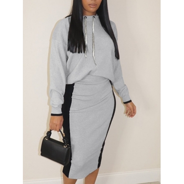 Lovely Casual Hooded Collar Drawstring Design Patchwork Grey Two Piece Skirt Set