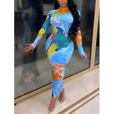 Lovely Street Turtleneck World Map Print Blue Mid Calf Dress