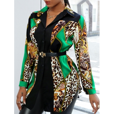 Lovely Trendy Leopard Print Patchwork Green Blouse(Without Belt)