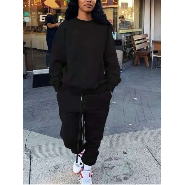 Lovely Sportswear O Neck Drawstring Design Black Two Piece Pants Set