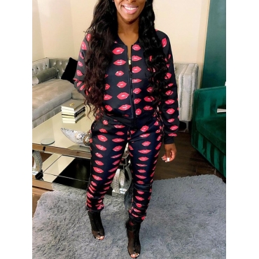 Lovely Casual Lip Print Zipper Design Black Two Piece Pants Set