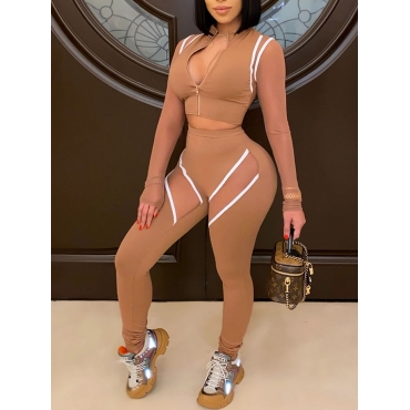 Lovely Chic Striped Mesh Patchwork Light Tan Two Piece Pants Set