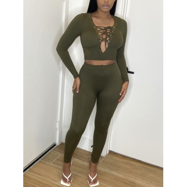 Lovely Chic Bandage Hollow-out Design Green Two Piece Pants Set