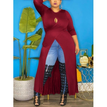 Lovely Casual O Neck Hollow-out Wine Red Plus Size T-shirt