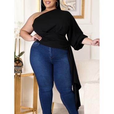 Lovely Stylish One Shoulder Asymmetrical Black Plus Size Blouse