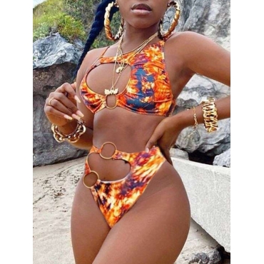 Lovely Casual Print Hollow-out Metal Accessories Decoration Yellow Two-piece Swimsuit
