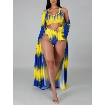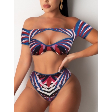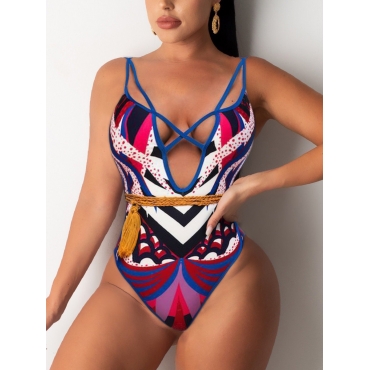 Lovely Casual Hollow-out Print Patchwork Blue Tankini