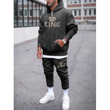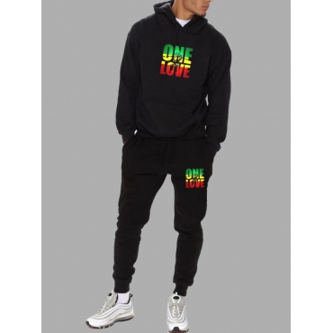 Lovely Street Letter Print Kangaroo Pocket Black Men Two Piece Pants Set