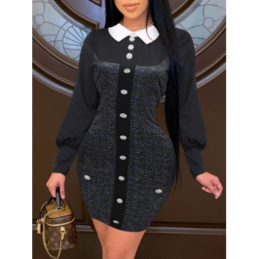 Lovely Trendy Button Design Patchwork Black Mini Dress