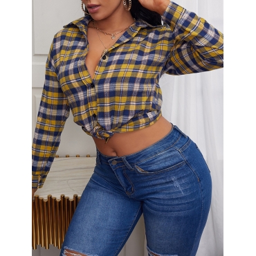 Lovely Casual Button Design Plaid Print Yellow Blouse