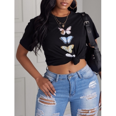 Lovely Casual O Neck Butterfly Print Black T-shirt